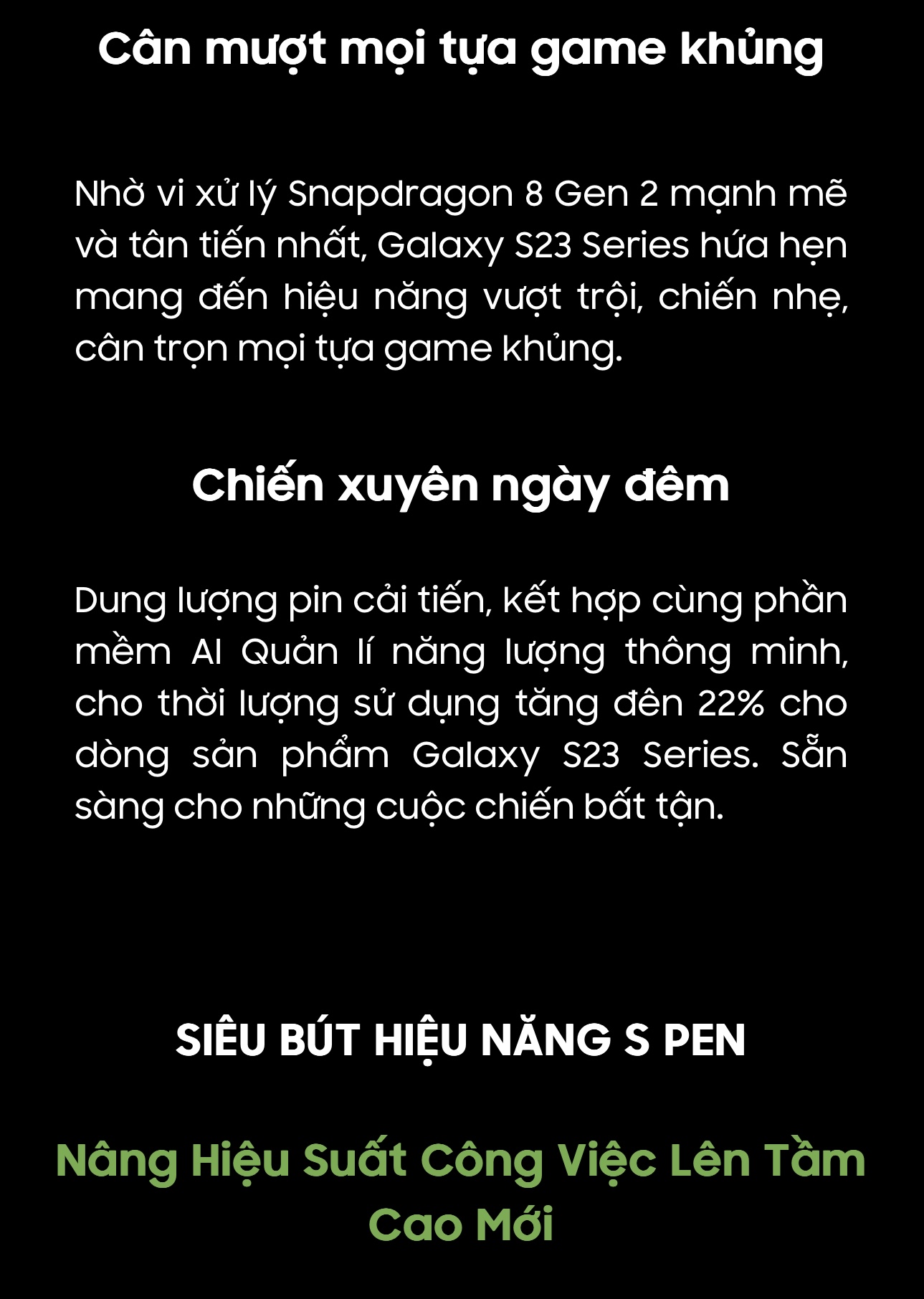 Trong thông số dòng Galaxy S mới (2023), điểm nâng cấp lớn nhất sẽ là hiệu năng. Đúng như dự đoán, Samsung sẽ không sử dụng chip Exynos. Galaxy S mới sẽ hoàn toàn sử dụng chip Snapdragon 8 Gen 2. Đây là con chip mới được ra mắt hiện nay. Con chip này có tốc độ xử lý hình ảnh cao hơn đến 25% so với Gen 1, hiệu suất xử lý tác vụ cao hơn 35%. Đặc biệt, nó sẽ còn giúp tiết kiệm điện năng lên đến 40% cho thiết bị.